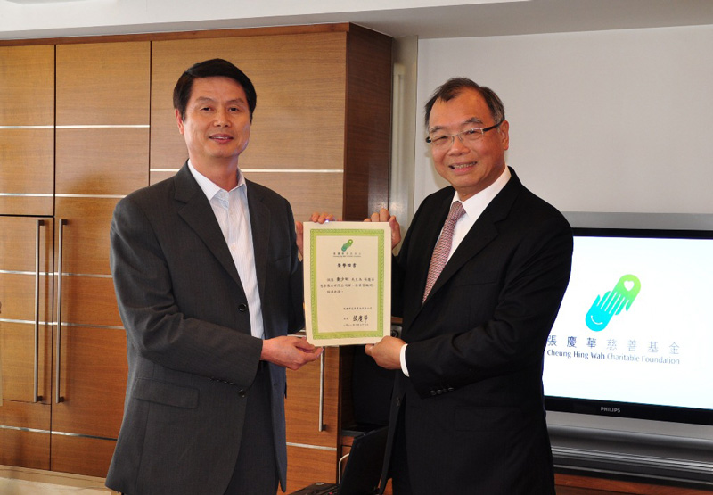 主席張慶華先生為第一屆榮譽顧問頒發榮譽證書,感謝黃少明先生(左)對基金會的支持。