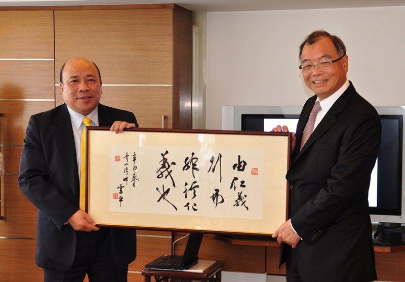 香港嘉應商會副會長盧平先生(左)致送一幅字畫予主席張慶華先生,祝賀基金會成立。
