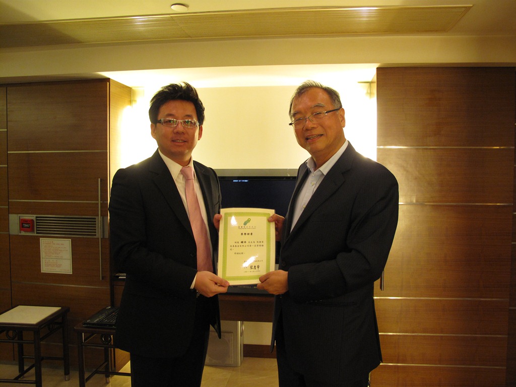 另一位榮譽顧問陳偉名先生(左)接受主席張慶華先生頒發之榮譽證書。